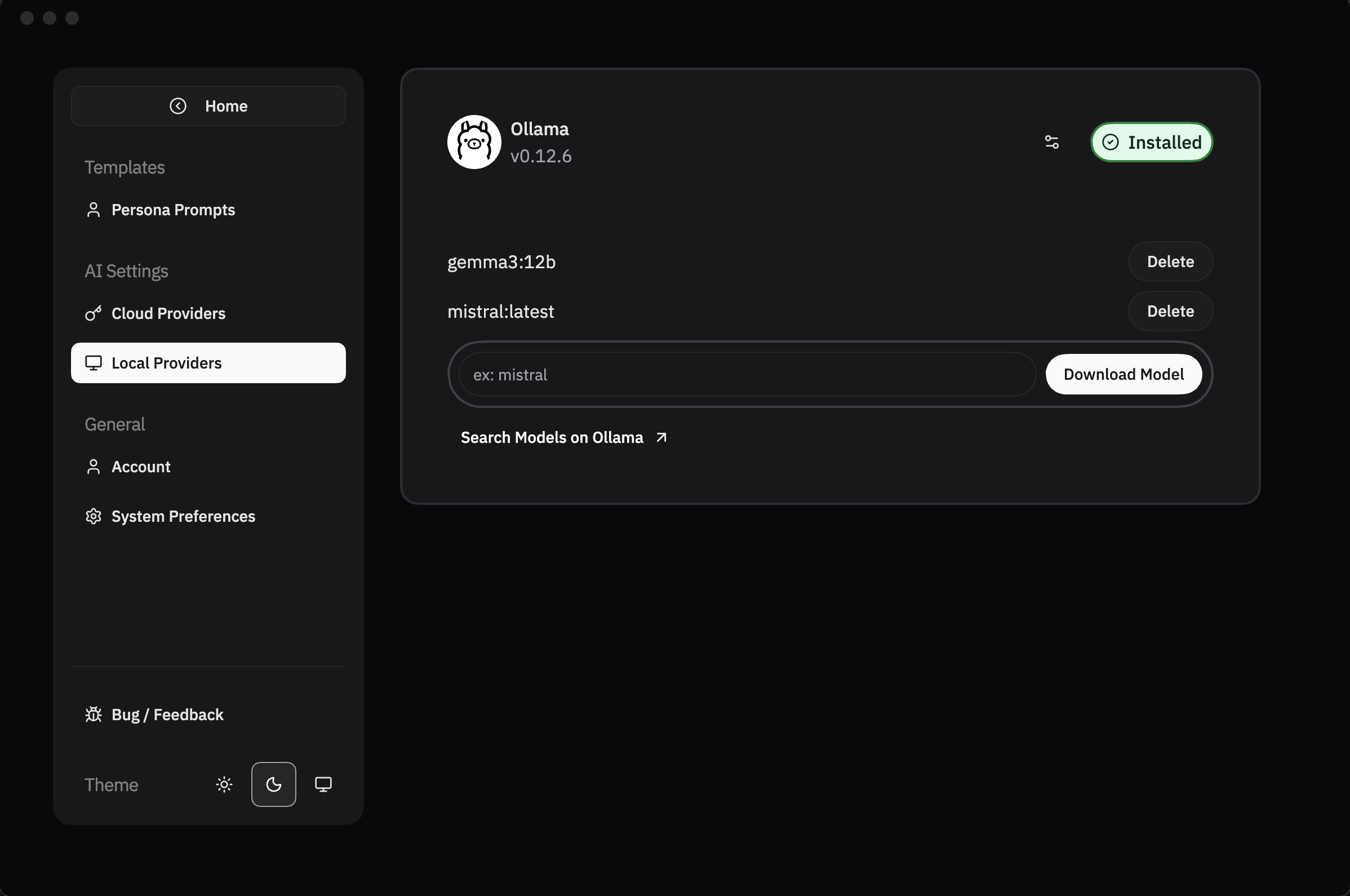 Navigate to the Settings > Local Providers > Paste the Model ID (e.g. gemma3:3b) and click Download Model. Wait for the model to be downloaded. Once downloaded, you can see the model in the list. These models are available for use in RabbitHoles.